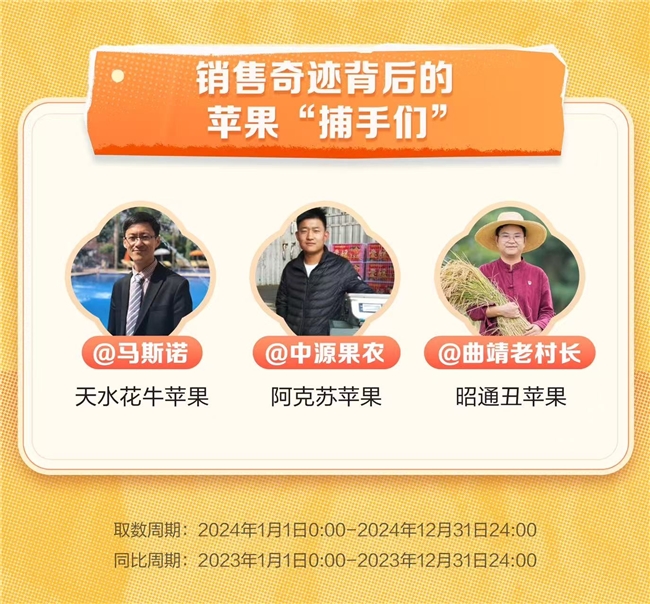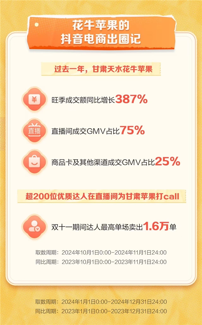 数据显示,过去一年,甘肃天水花牛苹果在平台旺季成交额同比增长387%,其中,直播间成交GMV占比75%。全年共有超200位优质创作者在直播间为甘肃苹果打call。去年双11期间,达人最高单场卖出1.6万单甘肃苹果,帮助产地鲜果被更多消费者所熟知。