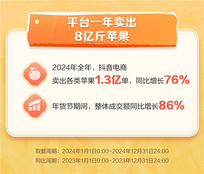 图鉴显示,2024年全年,抖音电商累计成交各类苹果1.3亿单,订单量较去年同比增长76%,约有8亿斤苹果从全国各地送往消费者的手中。年货节期间,苹果销售更是出现“小高峰”,成交额同比增长86%。