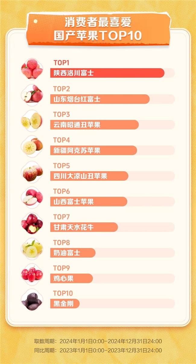 不同地区的消费者在苹果品种选择上也有差异,注重养生的广东吃货买走了全国大多数苹果,浙江人喜欢脆爽的陕西洛川富士,上海人爱吃香甜的新疆阿克苏苹果,四川人则支持本地的大凉山丑苹果,将其列为家中果盘的常客。