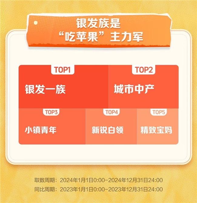 源于苹果营养价值丰富和易于消化等特点,很多人将吃苹果作为日常健康饮食的一部分。图鉴数据显示,在苹果消费人群中,银发一族以30%的成交额占比成为吃苹果的主力军,其次是城市中产、小镇青年、新锐白领和精致宝妈等。